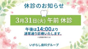 いつもいがらし歯科グループにご来院いただき、誠にありがとうございます。スタッフ研修に伴う診療時間の変更についてお知らせいたします。誠に勝手ながら、3月31日(火)の午前中は、いがらし歯科グループ(いがらし歯科医院・いがら […]