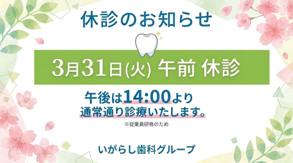 誠に勝手ながら、3月31日(火)の午前中は、いがらし歯科グループ(いがらし歯科医院・いがらし歯科イーストクリニック)の両院ともに、院内セミナー開催のため休診とさせていただきます。