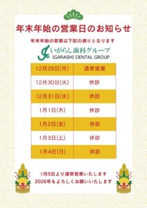 いつもいがらし歯科グループをご利用いただき、ありがとうございます。 誠に勝手ながら、下記の期間は年末年始のため休診とさせていただきます。 【年末年始休診期間】 2025年12月30日(火)~2026年1月4日(日) 1月 […]